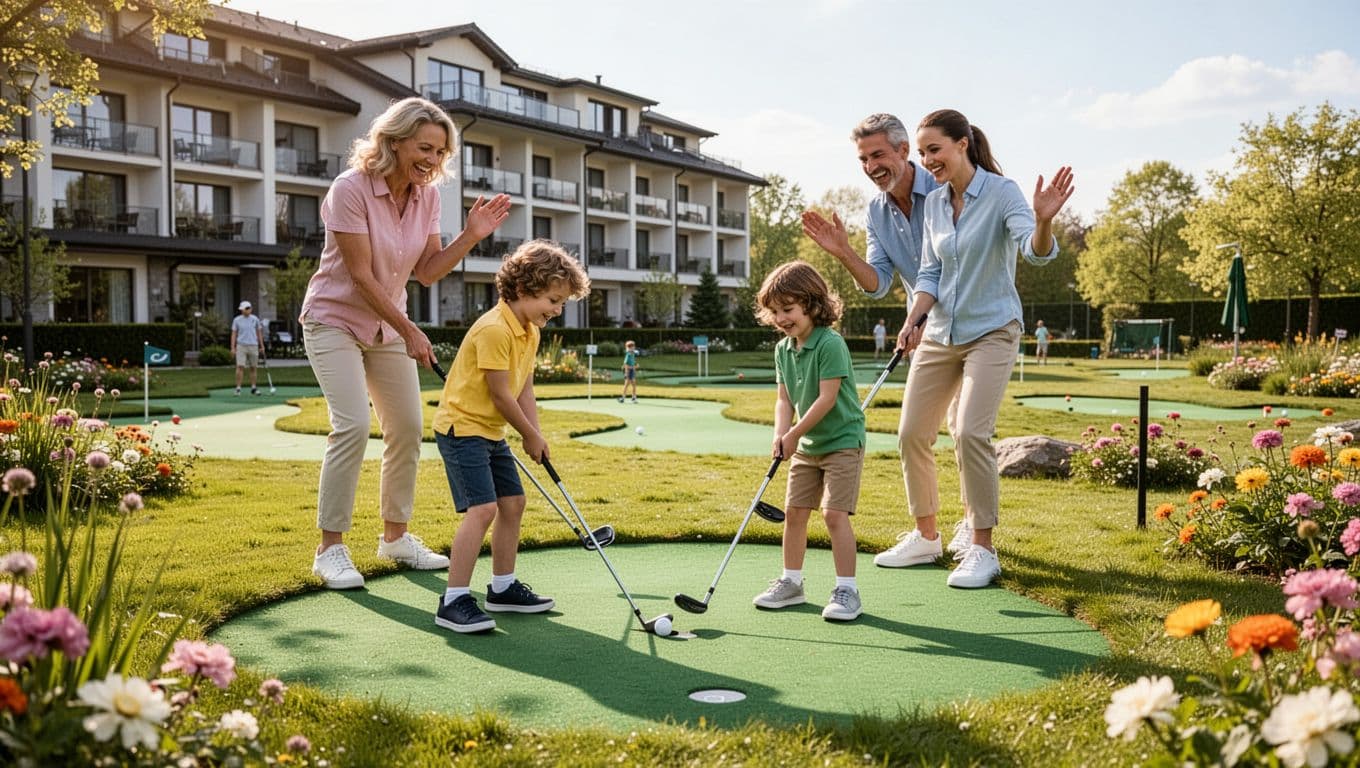 Minigolf er et godt eksempel. Det er simpelt, men børn elsker det, fordi alle kan være med. Et slag går skævt, en bold hopper af banen, og pludselig griner hele familien. Lige ved siden af giver legepladsen endnu en pauseknap, når voksne gerne vil trække vejret med en kop kaffe i hånden.